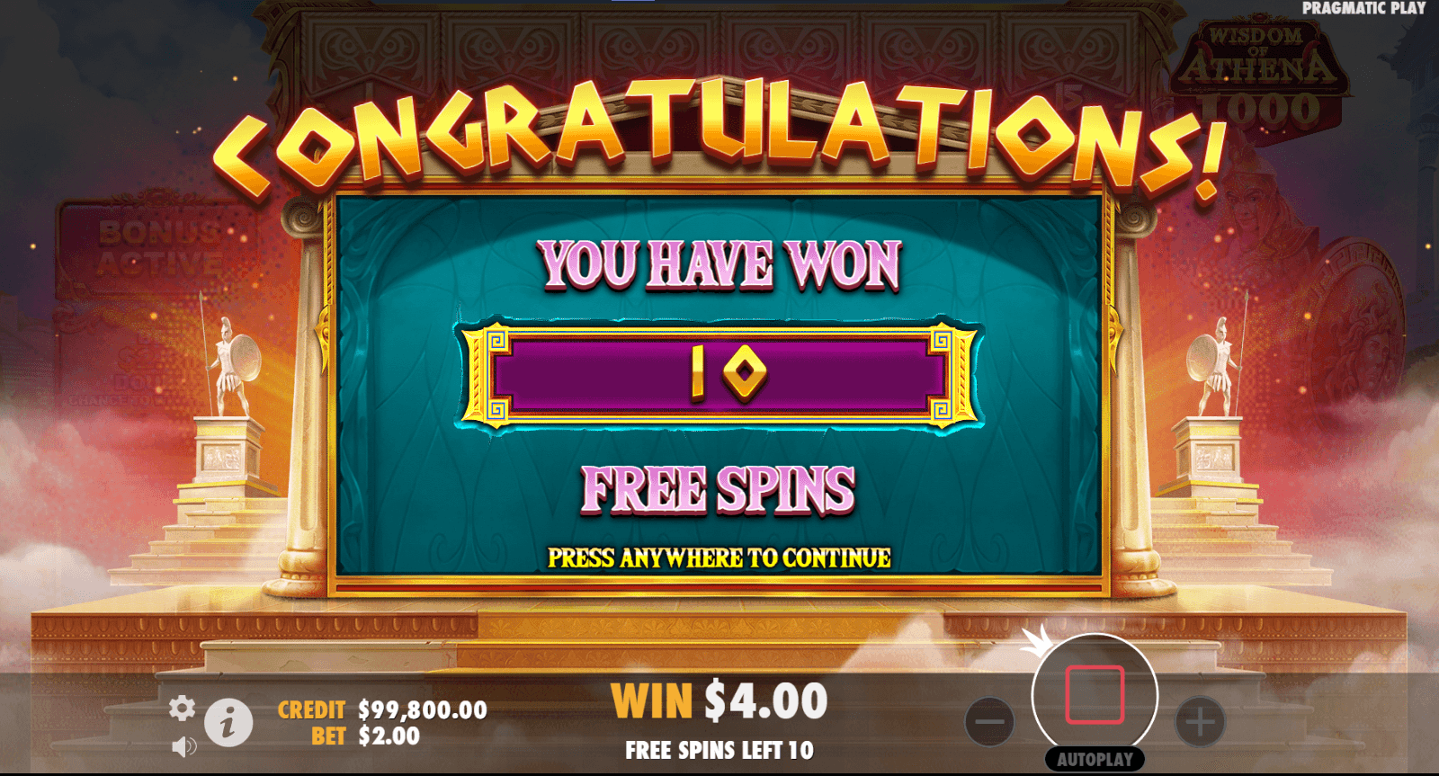 Three or more Athena Scatters trigger 10 Free Spins, while the Feature Buy at 75 × the bet grants direct access with one Wisdom Orb in place.